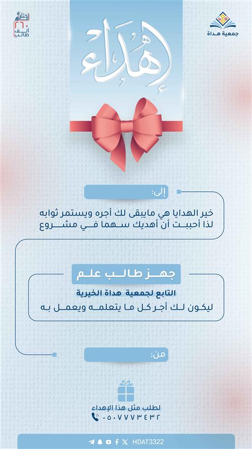 أهدي من تحب سهماً في مشروع تجهيز طالب علم ليكون له أجر كل ما يتعلمه ويعلمه